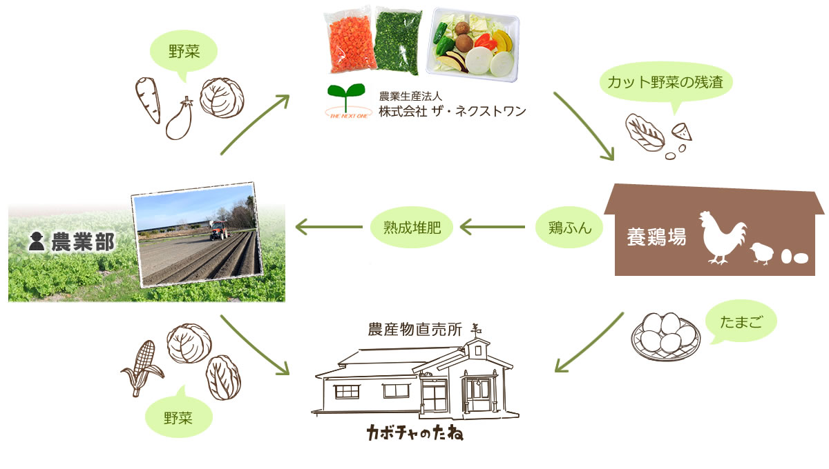 本社工場から出るカット野菜の残渣を捨処分することなく、鶏のエサや農業部の畑の堆肥に利用しています。なるべく地域の資源を利用して飼料や飼育環境を整え、できるだけ外部に依存しないで地域に還元するビジネスを目指しています。
